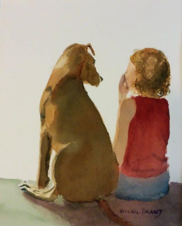 This watercolor painting is 16 x 14 inches and is on 140# watercolor painting. It is of a little girl sitting with her dog who is sitting in sympathy with her.
